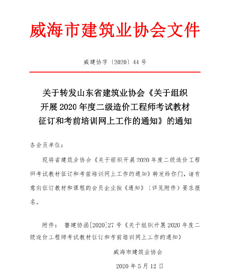 關(guān)于轉(zhuǎn)發(fā)山東省建筑業(yè)協(xié)會《關(guān)于組織 開展2020年度二級造價工程師考試教材 征訂和考前培訓(xùn)網(wǎng)上工作的通知》的通知