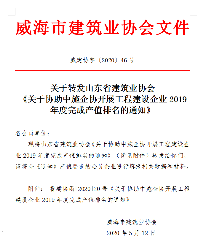 >關于轉發(fā)山東省建筑業(yè)協(xié)會 《關于協(xié)助中施企協(xié)開展工程建設企業(yè)2019年度完成產值排名的通知》