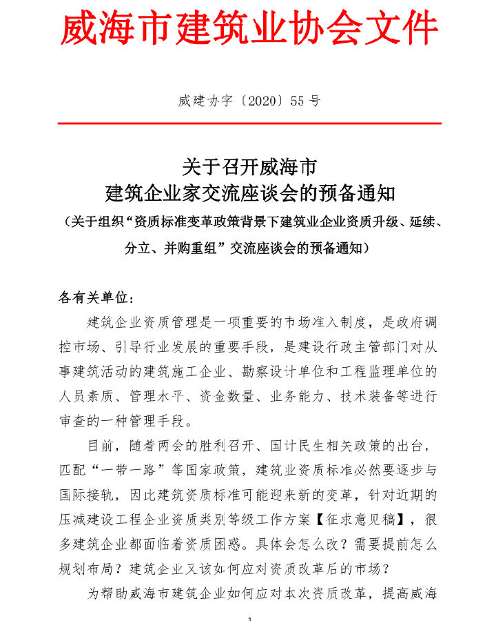 >關(guān)于召開威海市建筑企業(yè)家交流座談會(huì)的預(yù)備通知
