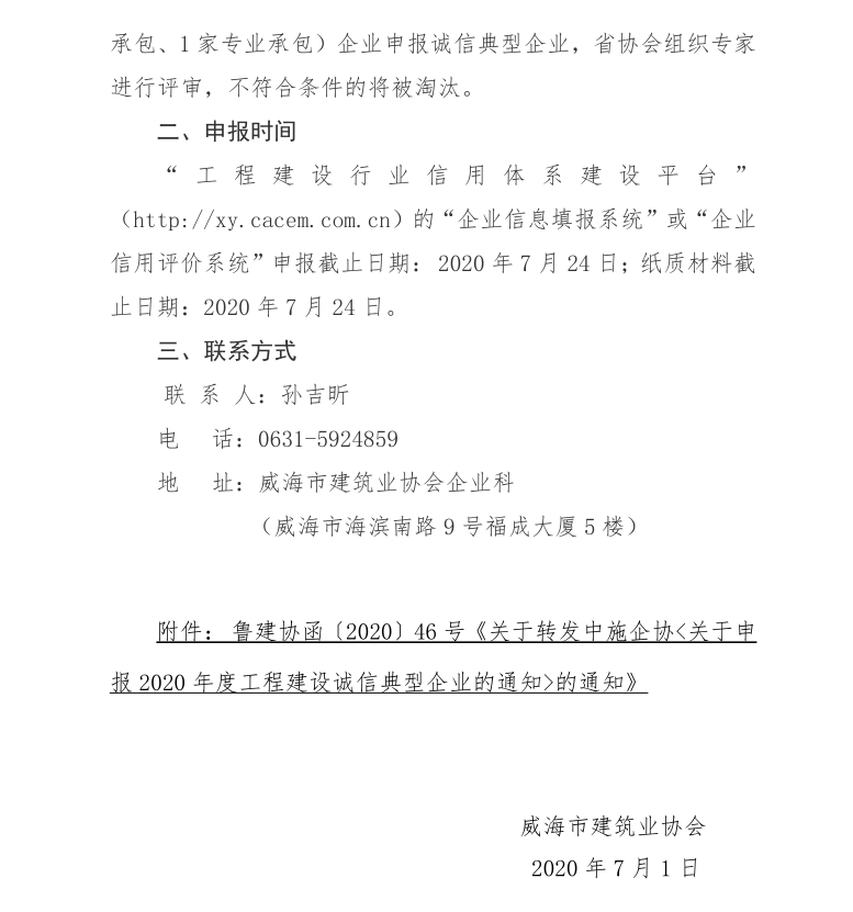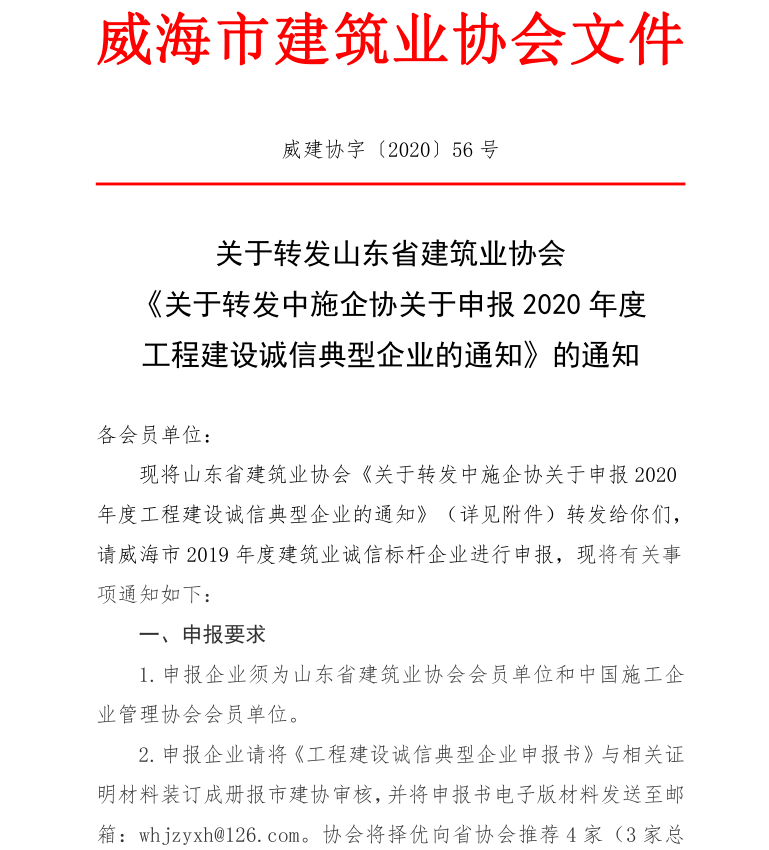 關(guān)于轉(zhuǎn)發(fā)山東省建筑業(yè)協(xié)會(huì) 《關(guān)于轉(zhuǎn)發(fā)中施企協(xié)關(guān)于申報(bào)2020年度 工程建設(shè)誠信典型企業(yè)的通知》的通知