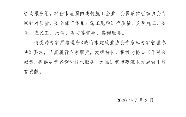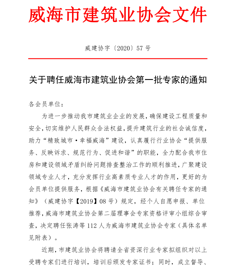>關(guān)于聘任威海市建筑業(yè)協(xié)會第一批專家的通知