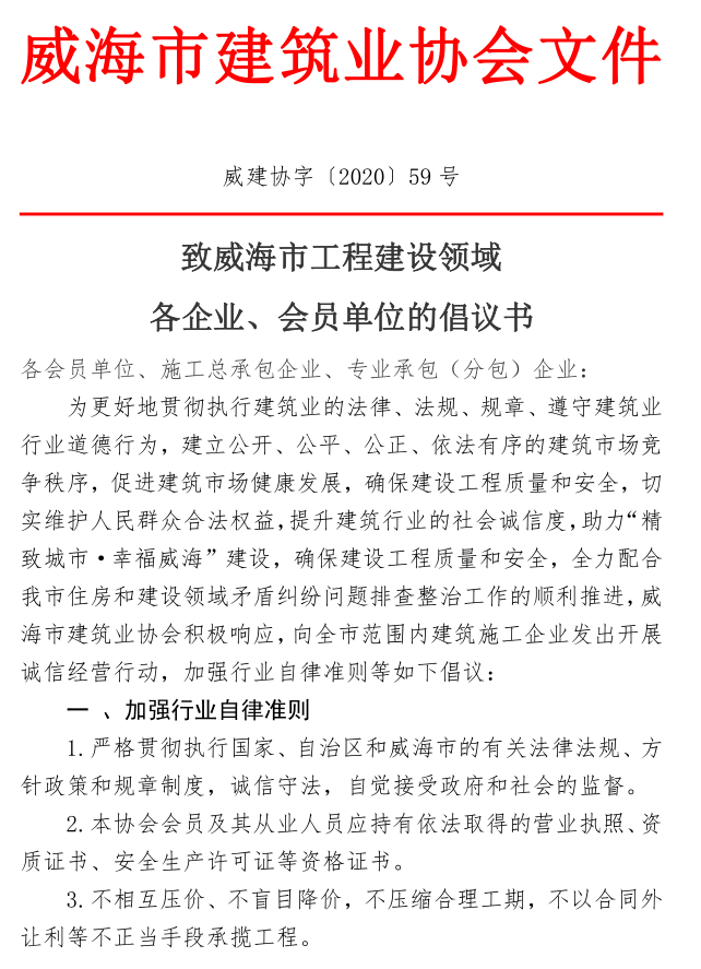 >致威海市工程建設(shè)領(lǐng)域各企業(yè)、會員單位的倡議書