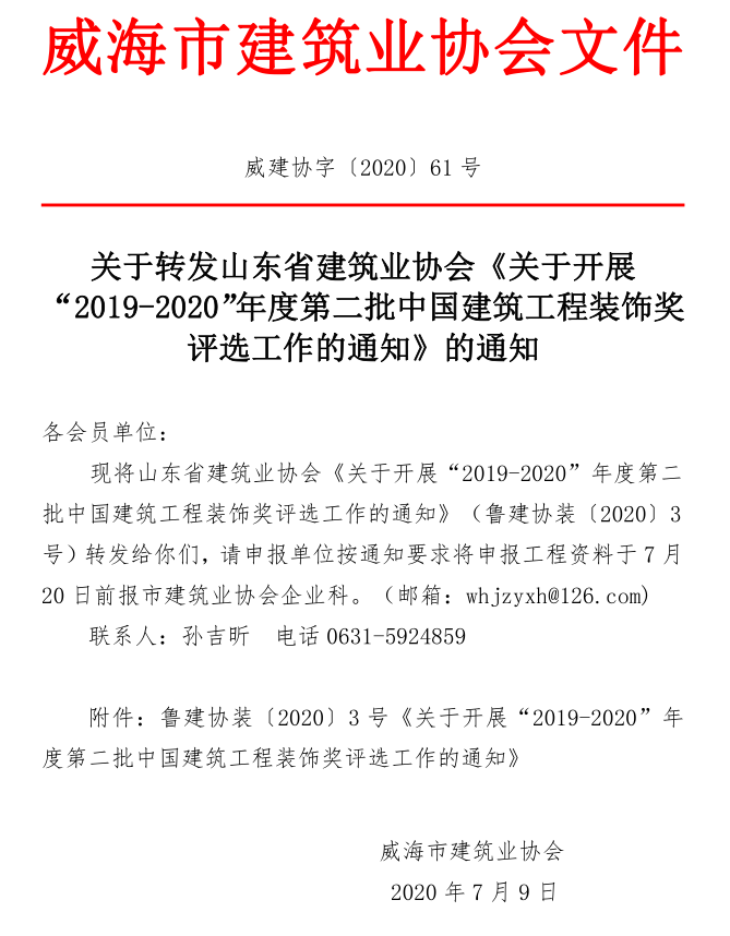 關于轉(zhuǎn)發(fā)山東省建筑業(yè)協(xié)會《關于開展“2019-2020”年度第二批中國建筑工程裝飾獎評選工作的通知》的通知