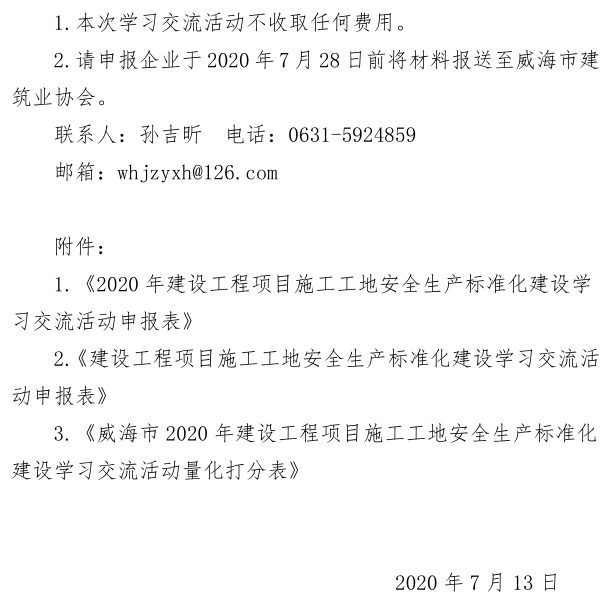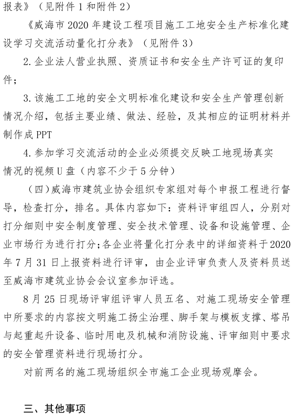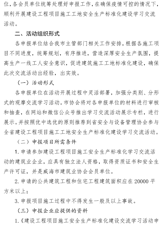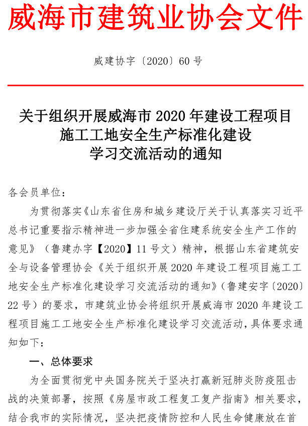 關(guān)于組織開展威海市2020年建設(shè)工程項目施工工地安全生產(chǎn)標(biāo)準(zhǔn)化建設(shè)學(xué)習(xí)交流活動的通知