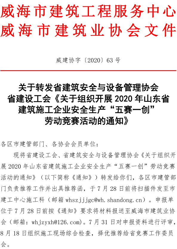關于轉發(fā)省建筑安全與設備管理協(xié)會 省建設工會《關于組織開展2020年山東省 建筑施工企業(yè)安全生產(chǎn)“五賽一創(chuàng)” 勞動競賽活動的通知》