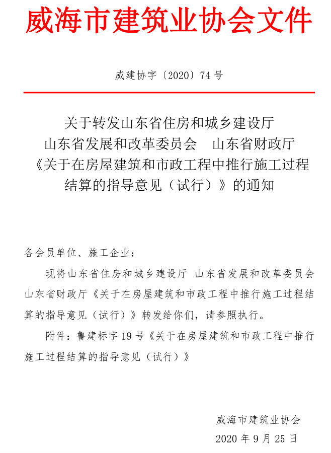 關(guān)于轉(zhuǎn)發(fā)山東省住房和城鄉(xiāng)建設(shè)廳 山東省發(fā)展和改革委員會 山東省財政廳 《關(guān)于在房屋建筑和市政工程中推行施工過程結(jié)算的指導意見(試行)》的通知