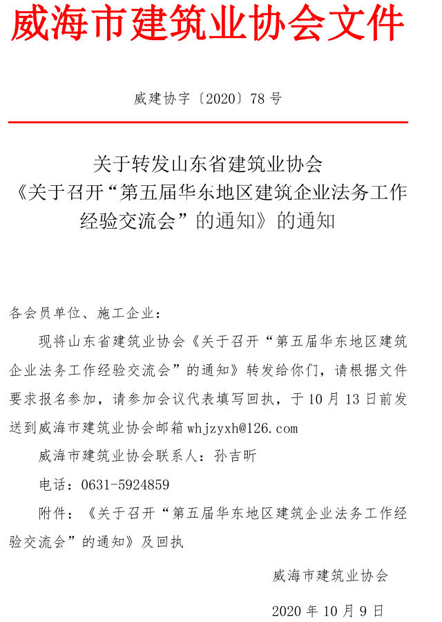 關(guān)于轉(zhuǎn)發(fā)山東省建筑業(yè)協(xié)會(huì) 《關(guān)于召開“第五屆華東地區(qū)建筑企業(yè)法務(wù)工作經(jīng)驗(yàn)交流會(huì)”的通知》的通知