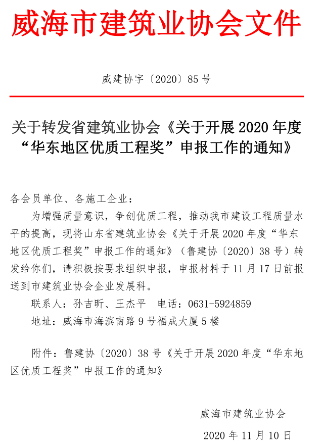 - 當(dāng)前位置:首頁(yè) >文件公告>關(guān)于轉(zhuǎn)發(fā)省建筑業(yè)協(xié)會(huì)《關(guān)于開(kāi)展2020年度“華東地區(qū)優(yōu)質(zhì)工程獎(jiǎng)”申報(bào)工作的通知》