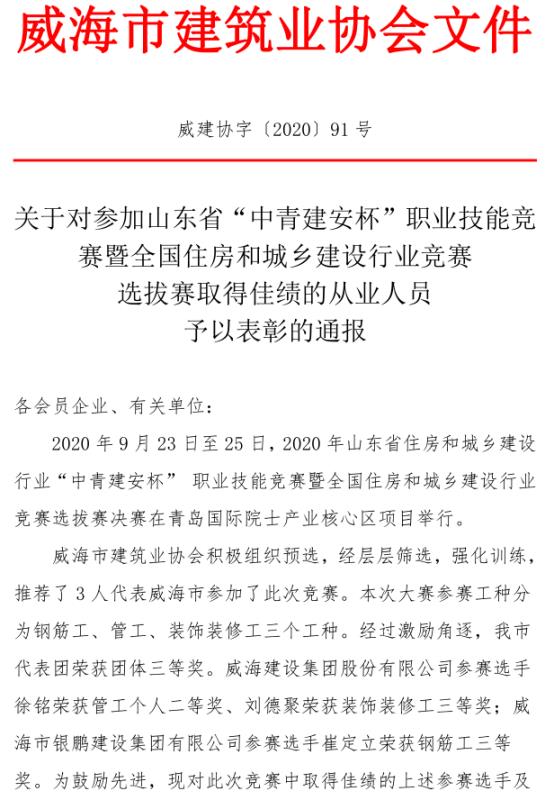 關(guān)于對參加山東省“中青建安杯”職業(yè)技能競賽暨全國住房和城鄉(xiāng)建設(shè)行業(yè)競賽 選拔賽取得佳績的從業(yè)人員予以表彰的通報(bào)