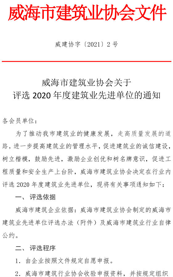 威海市建筑業(yè)協(xié)會(huì)關(guān)于 評(píng)選2020年度建筑業(yè)先進(jìn)單位的通知