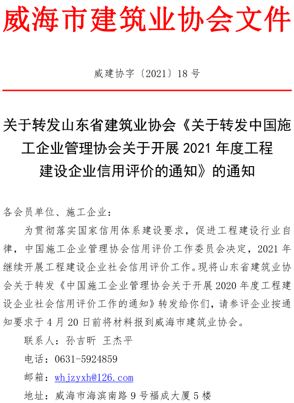 關(guān)于轉(zhuǎn)發(fā)山東省建筑業(yè)協(xié)會《關(guān)于轉(zhuǎn)發(fā)中國施工企業(yè)管理協(xié)會關(guān)于開展2021年度工程 建設(shè)企業(yè)信用評價的通知》的通知