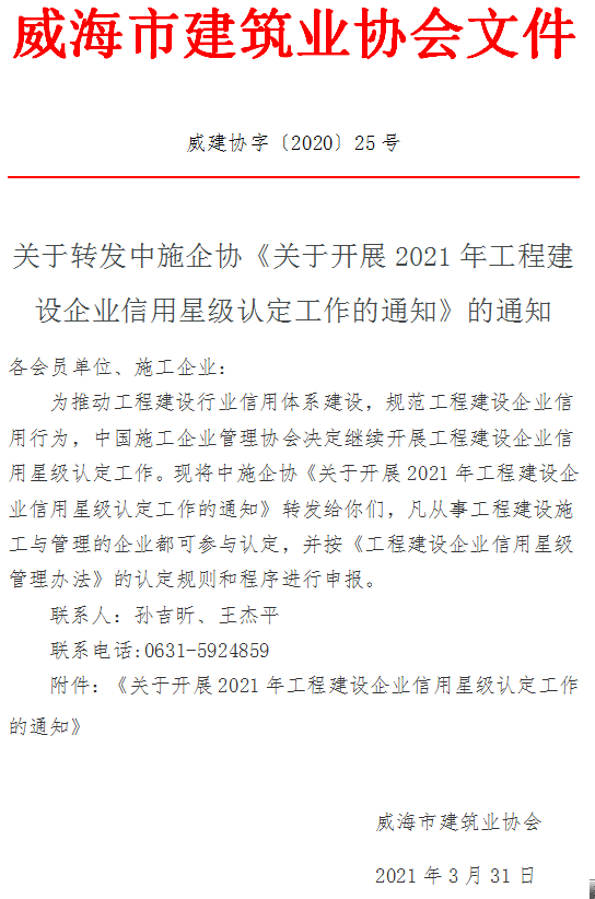 >關(guān)于轉(zhuǎn)發(fā)中施企協(xié)《關(guān)于開展2021年工程建 設(shè)企業(yè)信用星級(jí)認(rèn)定工作的通知》的通知