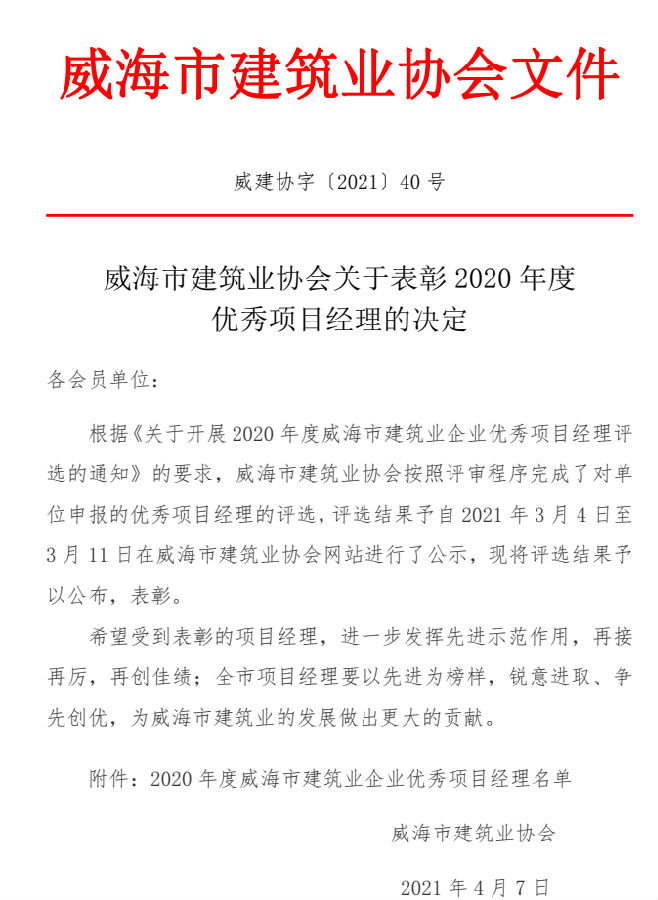 >威海市建筑業(yè)協(xié)會(huì)關(guān)于表彰2020年度優(yōu)秀項(xiàng)目經(jīng)理的決定