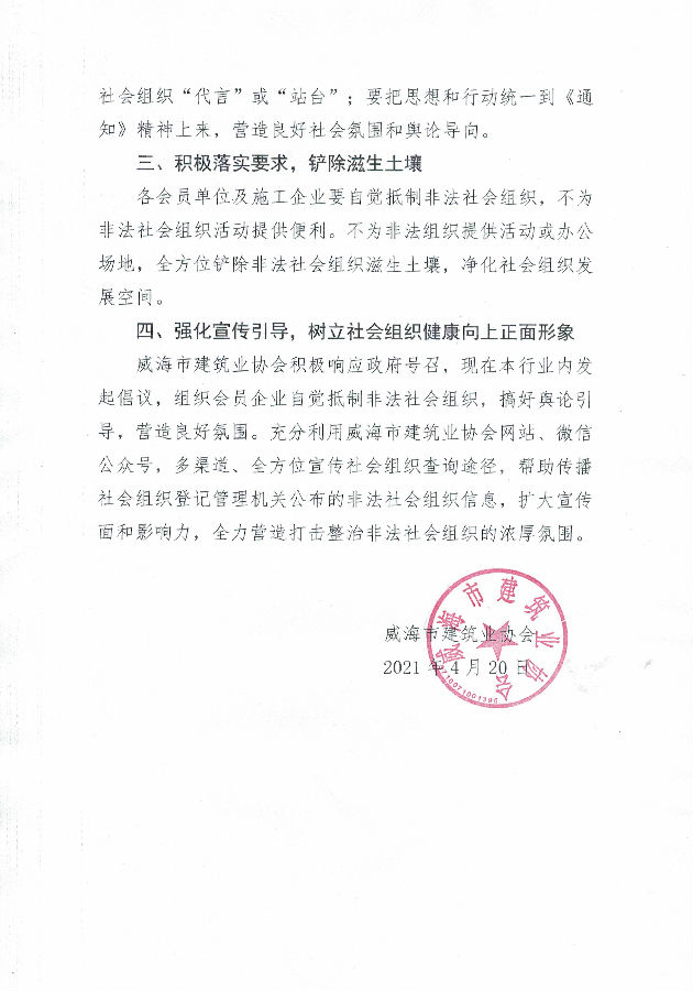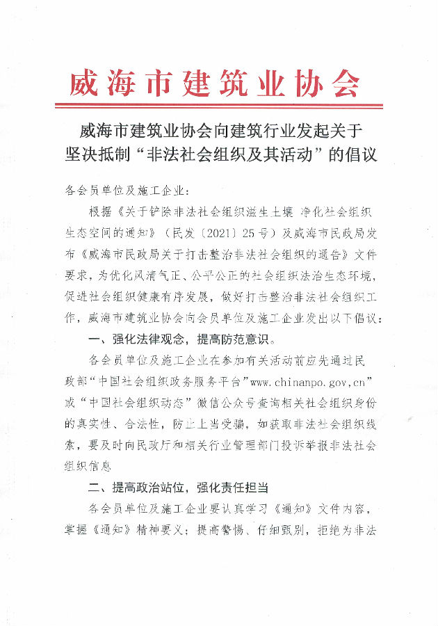 >威海市建筑業(yè)協(xié)會(huì)向建筑行業(yè)發(fā)起關(guān)于 堅(jiān)決抵制“非法社會(huì)組織及其活動(dòng)”的倡議