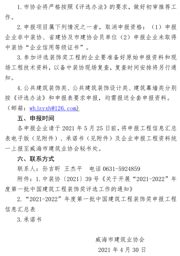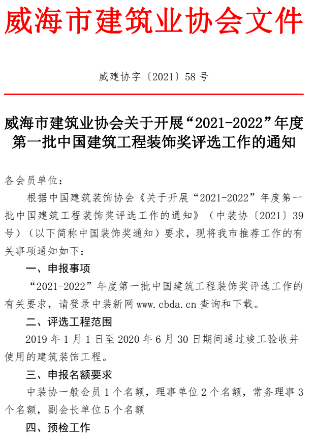 >威海市建筑業(yè)協(xié)會(huì)關(guān)于開展“2021-2022”年度第一批中國(guó)建筑工程裝飾獎(jiǎng)評(píng)選工作的通知