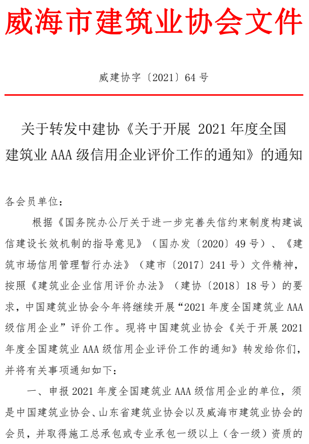 關(guān)于轉(zhuǎn)發(fā)中建協(xié)《關(guān)于開展 2021年度全國 建筑業(yè)AAA級信用企業(yè)評價工作的通知》的通知