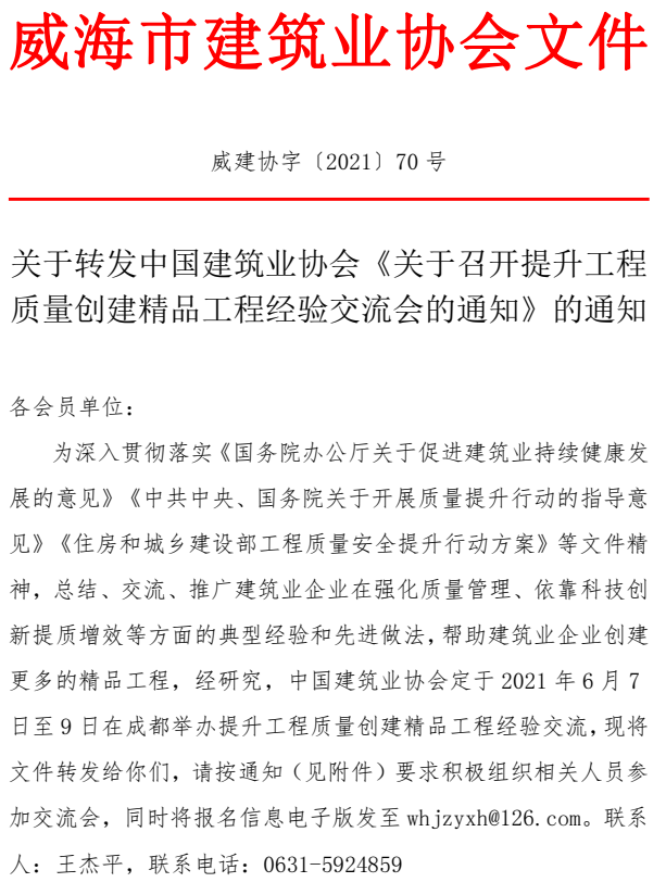 關(guān)于轉(zhuǎn)發(fā)中國(guó)建筑業(yè)協(xié)會(huì)《關(guān)于召開(kāi)提升工程質(zhì)量創(chuàng)建精品工程經(jīng)驗(yàn)交流會(huì)的通知》的通知