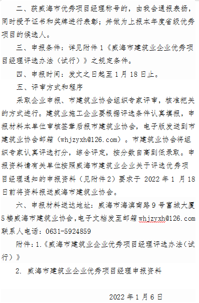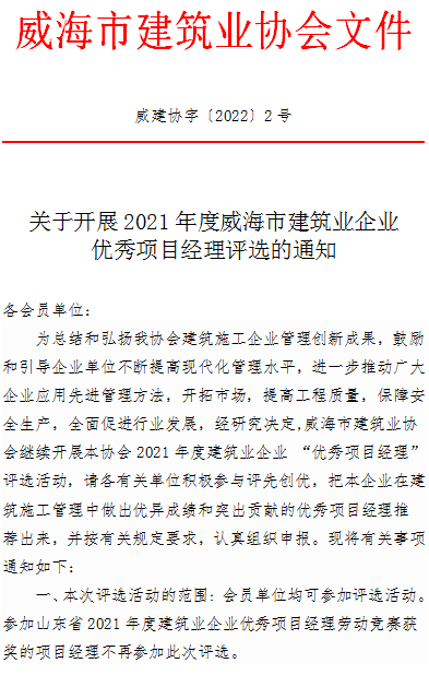 >關(guān)于開展2021年度威海市建筑業(yè)企業(yè)優(yōu)秀項(xiàng)目經(jīng)理評(píng)選的通知