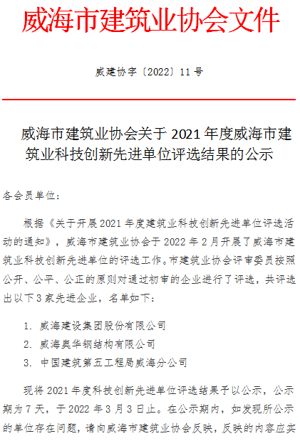 威海市建筑業(yè)協(xié)會關(guān)于2021年度威海市建筑業(yè)科技創(chuàng)新先進(jìn)單位評選結(jié)果的公示