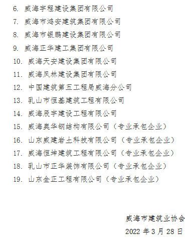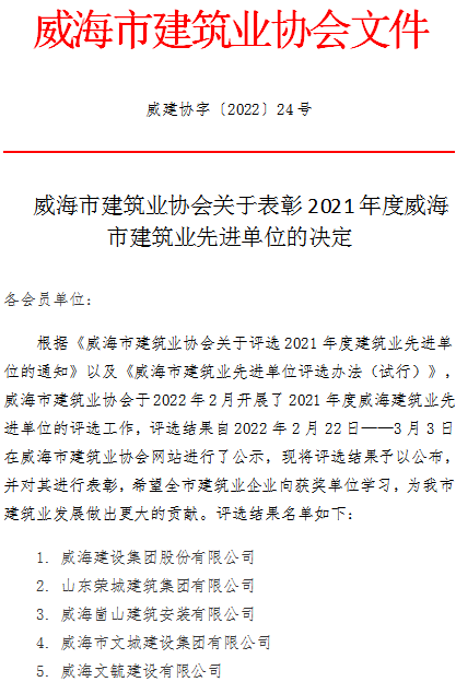 >威海市建筑業(yè)協(xié)會關(guān)于表彰2021年度威海市建筑業(yè)先進單位的決定