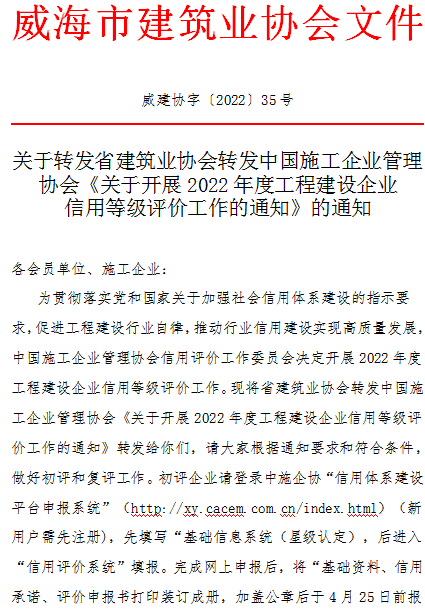 關(guān)于轉(zhuǎn)發(fā)省建筑業(yè)協(xié)會(huì)轉(zhuǎn)發(fā)中國(guó)施工企業(yè)管理協(xié)會(huì)《關(guān)于開(kāi)展2022年度工程建設(shè)企業(yè)信用等級(jí)評(píng)價(jià)工作的通知》的通知