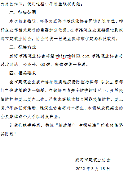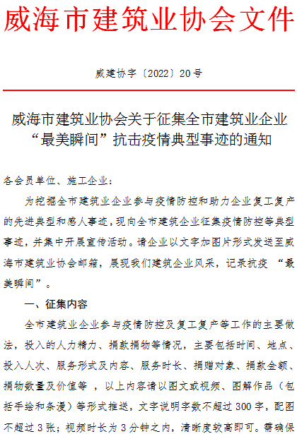 >威海市建筑業(yè)協(xié)會(huì)關(guān)于征集全市建筑業(yè)企業(yè)“最美瞬間”抗擊疫情典型事跡的通知