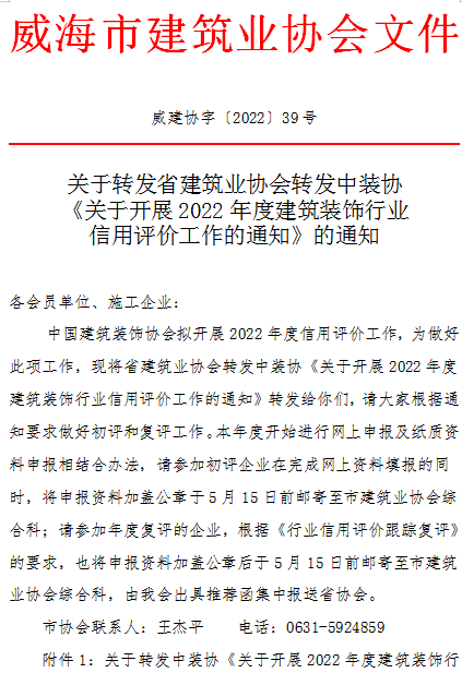 關(guān)于轉(zhuǎn)發(fā)省建筑業(yè)協(xié)會(huì)轉(zhuǎn)發(fā)中裝協(xié)《關(guān)于開展2022年度建筑裝飾行業(yè)信用評(píng)價(jià)工作的通知》的通知
