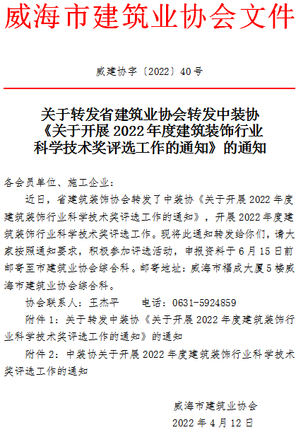 關(guān)于轉(zhuǎn)發(fā)省建筑業(yè)協(xié)會(huì)轉(zhuǎn)發(fā)中裝協(xié)《關(guān)于開展2022年度建筑裝飾行業(yè)科學(xué)技術(shù)獎(jiǎng)評(píng)選工作的通知》的通知