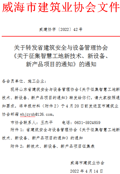 關(guān)于轉(zhuǎn)發(fā)省建筑安全與設(shè)備管理協(xié)會(huì)《關(guān)于征集智慧工地新技術(shù)、新設(shè)備、新產(chǎn)品項(xiàng)目的通知》的通知