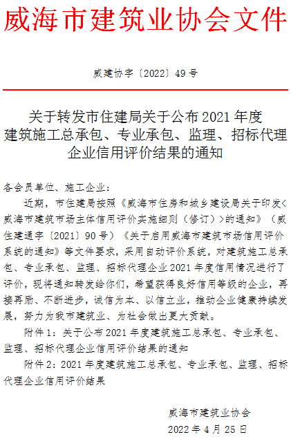 關(guān)于轉(zhuǎn)發(fā)市住建局關(guān)于公布2021年度建筑施工總承包、專業(yè)承包、監(jiān)理、招標(biāo)代理企業(yè)信用評(píng)價(jià)結(jié)果的通知