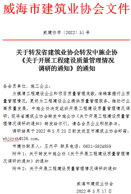 關(guān)于轉(zhuǎn)發(fā)省建筑業(yè)協(xié)會(huì)轉(zhuǎn)發(fā)中施企協(xié)《關(guān)于開展工程建設(shè)質(zhì)量管理情況調(diào)研的通知》的通知