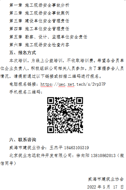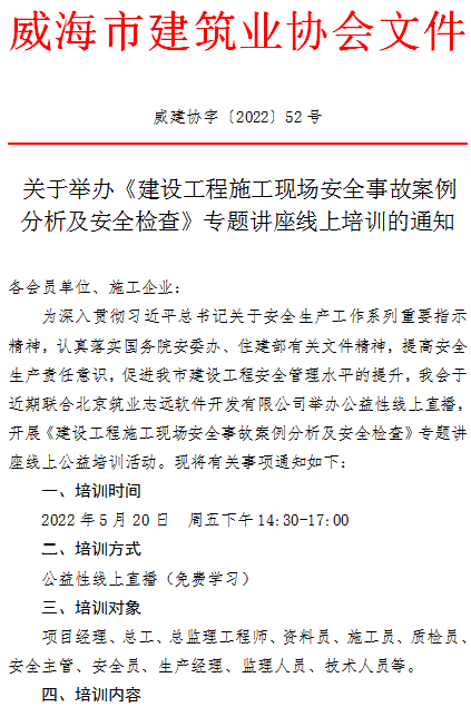 >威海市建筑業(yè)協(xié)會關于舉辦《建設工程施工現場安全事故案例分析及安全檢查》專題講座線上培訓的通知