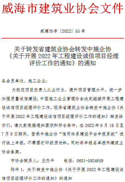 關(guān)于轉(zhuǎn)發(fā)省建筑業(yè)協(xié)會(huì)轉(zhuǎn)發(fā)中施企協(xié)《關(guān)于開展2022年工程建設(shè)誠(chéng)信項(xiàng)目經(jīng)理評(píng)價(jià)工作的通知》的通知
