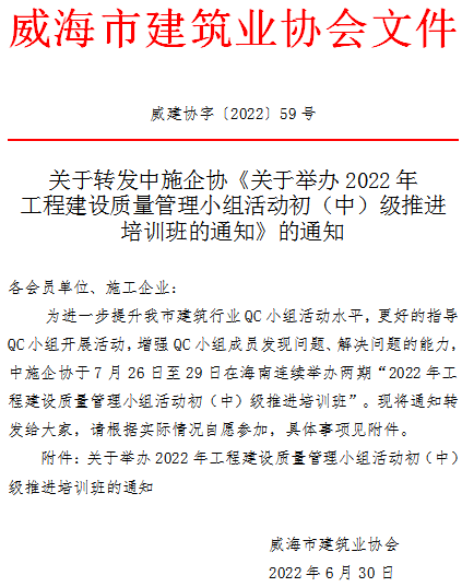 關(guān)于轉(zhuǎn)發(fā)中施企協(xié)《關(guān)于舉辦2022年工程建設(shè)質(zhì)量管理小組活動(dòng)初(中)級(jí)推進(jìn)培訓(xùn)班的通知》的通知