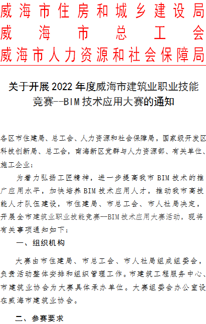 關(guān)于開展2022年度威海市建筑業(yè)職業(yè)技能競賽--BIM技術(shù)應(yīng)用大賽的通知