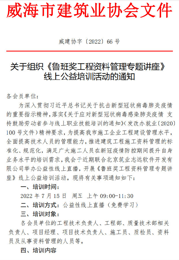 >關(guān)于組織《魯班獎工程資料管理專題講座》 線上公益培訓活動的通知