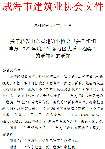 >關(guān)于轉(zhuǎn)發(fā)山東省建筑業(yè)協(xié)會《關(guān)于組織申報(bào)2022年度“華東地區(qū)優(yōu)質(zhì)工程獎”的通知》的通知
