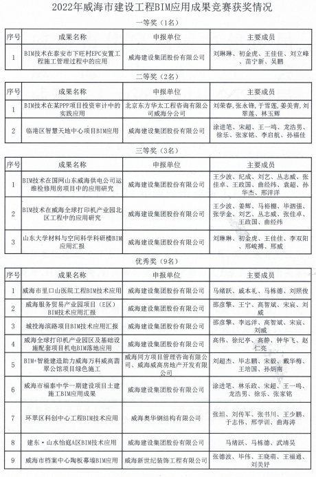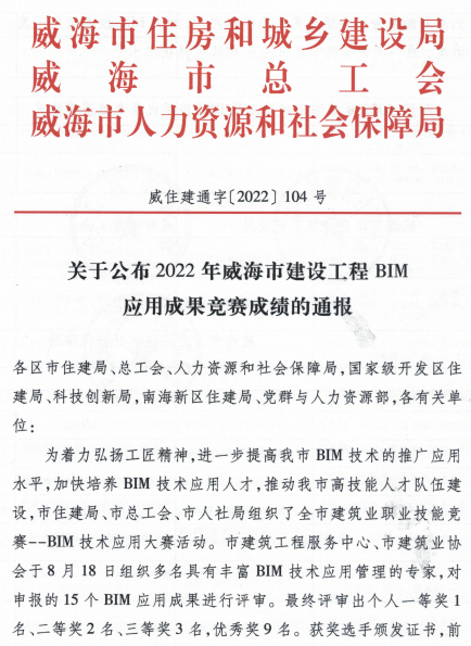 >關于公布2022年威海市建設工程BIM應用成果競賽成績的通報