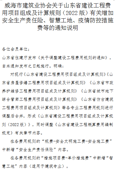安責(zé)險(xiǎn)、智慧工地和疫情防控措施費(fèi)--威海市建筑業(yè)協(xié)會(huì)關(guān)于山東省住建廳發(fā)布《關(guān)于調(diào)整建設(shè)工程費(fèi)用規(guī)則的通知》的說明