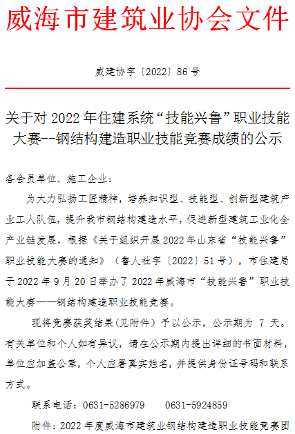>威海市建筑業(yè)協(xié)會(huì)關(guān)于對(duì)2022年住建系統(tǒng)“技能興魯”職業(yè)技能大賽--鋼結(jié)構(gòu)建造職業(yè)技能競(jìng)賽成績(jī)的公示