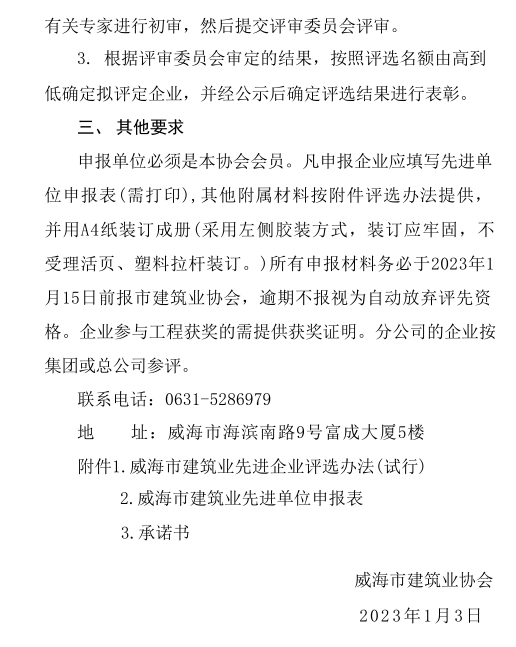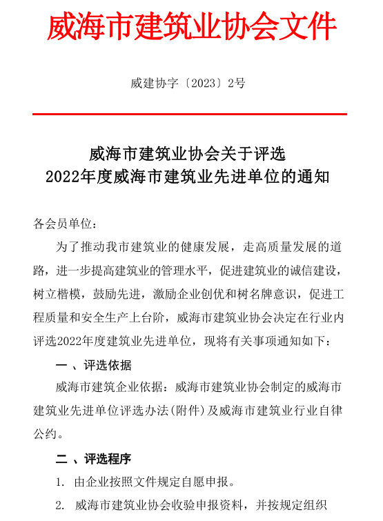 >威海市建筑業(yè)協(xié)會(huì)關(guān)于評(píng)選 2022年度威海市建筑業(yè)先進(jìn)單位的通知