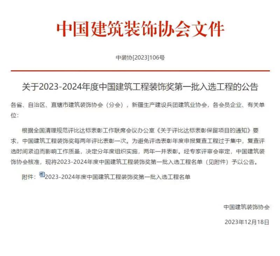近日,中國(guó)建筑裝飾協(xié)會(huì)發(fā)布《關(guān)于2023-2024年度中國(guó)建筑工程裝飾獎(jiǎng)第一批入選工程的公告》(中裝協(xié)〔2023〕106號(hào)),我市推薦申報(bào)的4項(xiàng)工程被授予“中國(guó)建筑工程裝飾獎(jiǎng)”,其中公共建筑裝飾類4項(xiàng),建筑幕墻類1項(xiàng)。