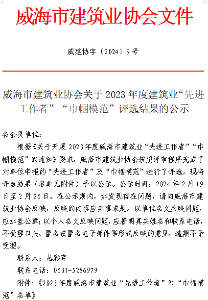 >威建協(xié)字2024年9號威海市建筑業(yè)協(xié)會關(guān)于對2023年度“先進工作者”“巾幗模范”評選結(jié)果的公示