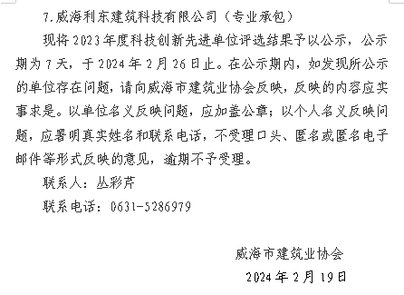 >威建協(xié)字2024年10號威海市建筑業(yè)協(xié)會關(guān)于對2023年度威海市建筑業(yè)科技創(chuàng)新先進單位評選結(jié)果的公示