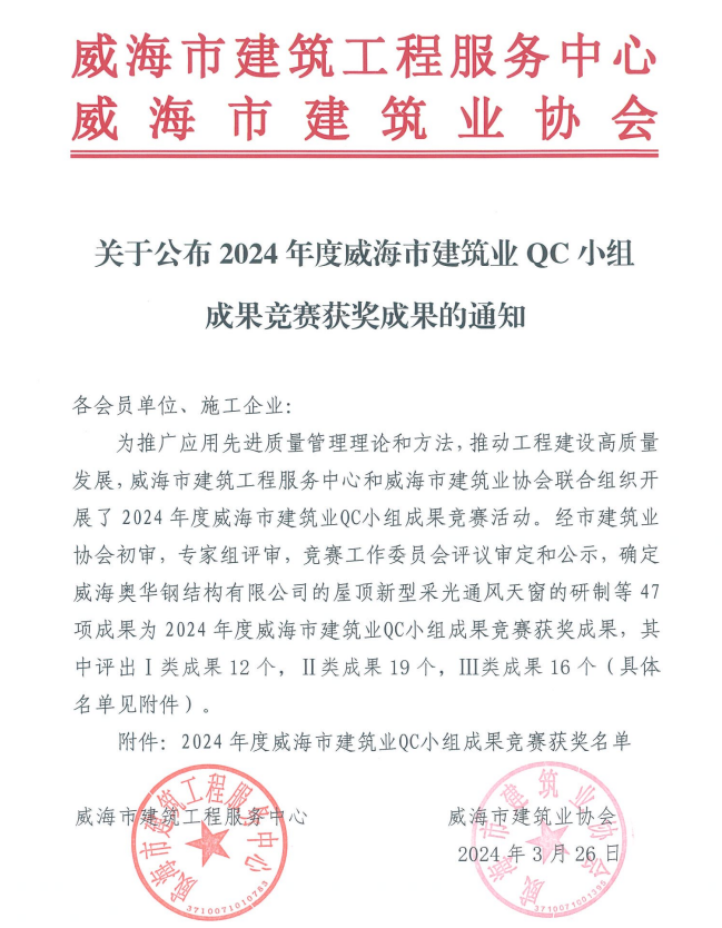 >關(guān)于公布2024年威海市建筑業(yè)QC小組成果競賽獲獎成果的通知
