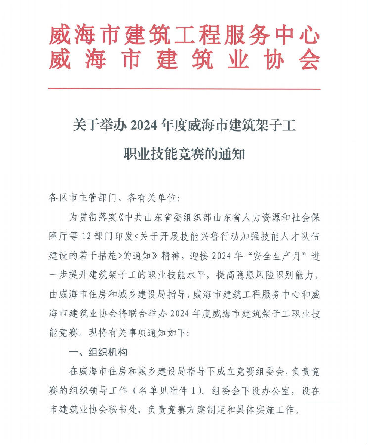 關(guān)于舉辦2024年度威海市建筑架子工職業(yè)技能競(jìng)賽的通知