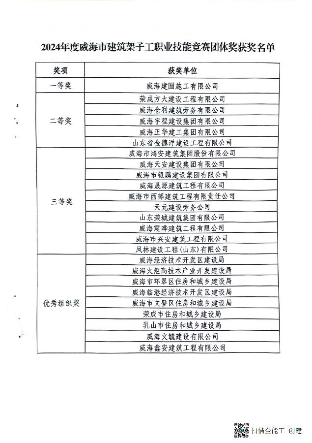 >關(guān)于公布2024年度威海市建筑架子工職業(yè)技能競(jìng)賽成績(jī)的通報(bào)