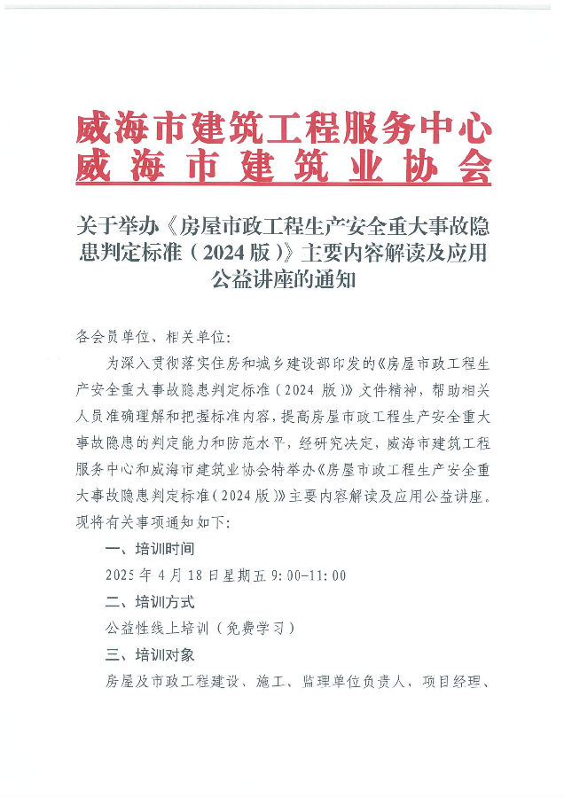 >關(guān)于舉辦《房屋市政工程生產(chǎn)安全重大事故隱患判定標準(2024版)》主要內(nèi)容解讀及應(yīng)用公益講座的通知